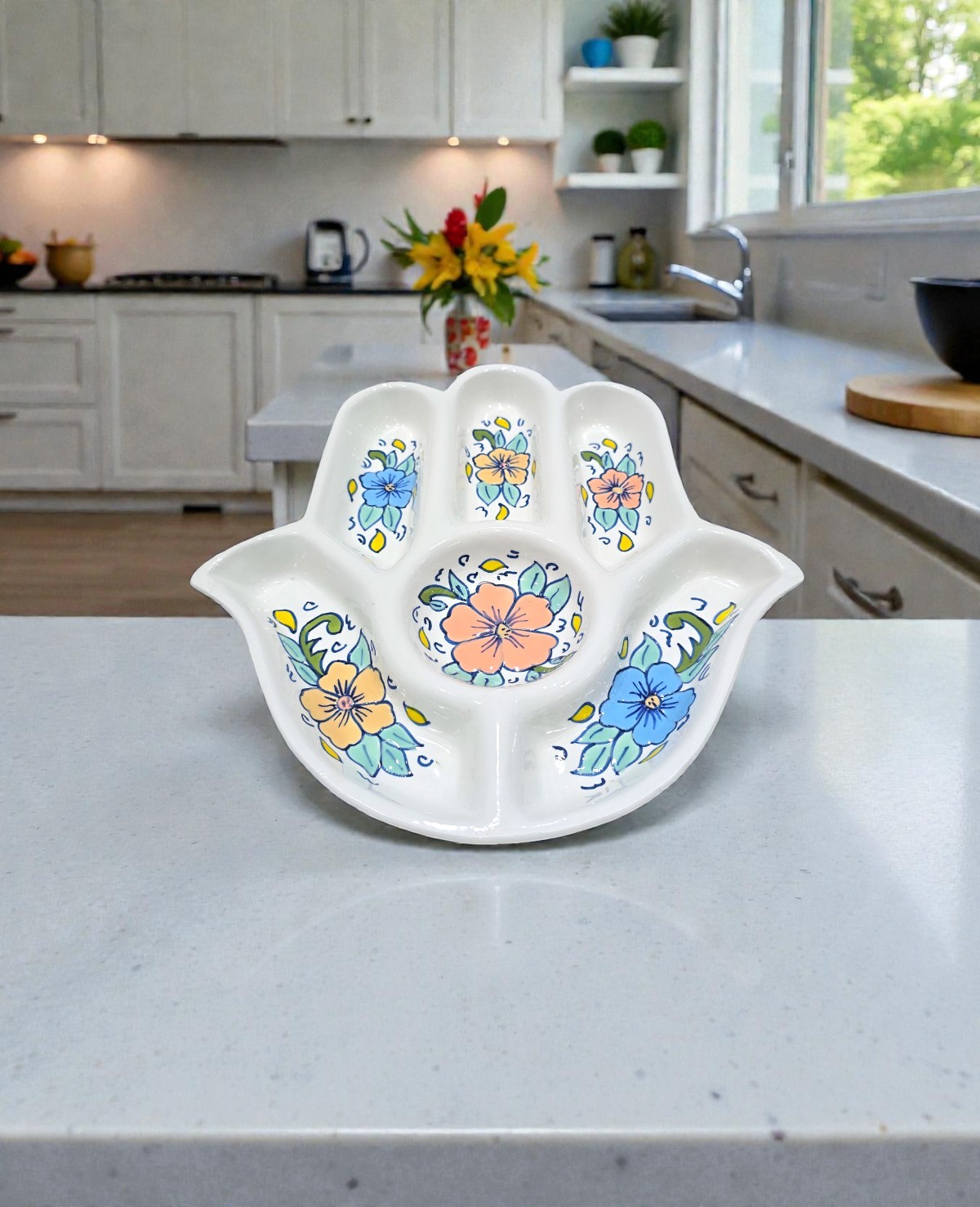 Astuce déco :Utilisez le plateau khomsa Flowers Pastel comme centre de table décoratif ou pour présenter sauces et amuse-bouches lors de vos réceptions pour une table chaleureuse et raffinée.