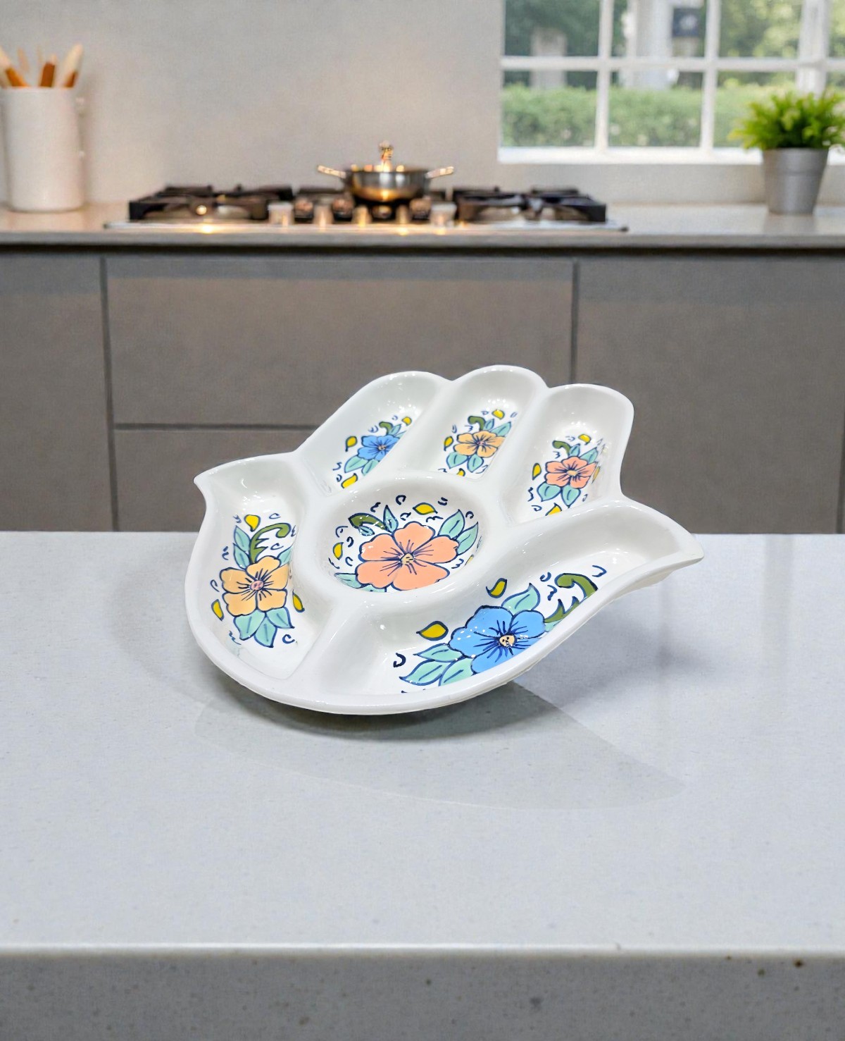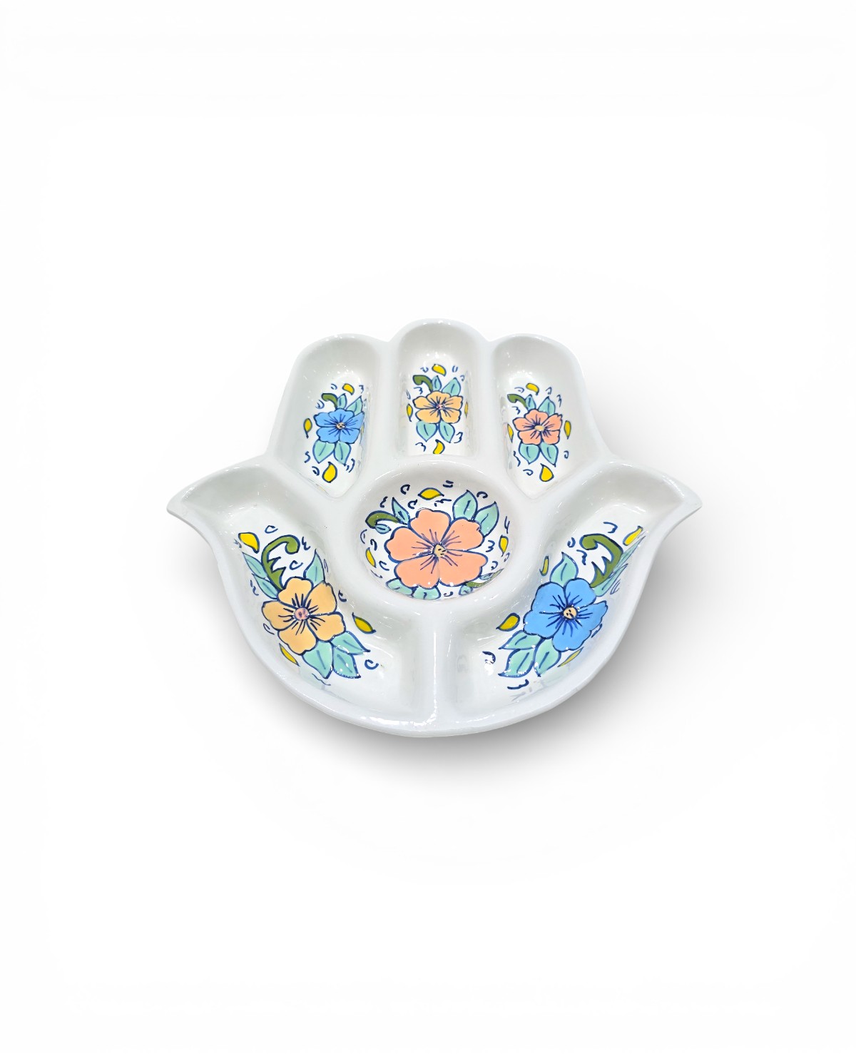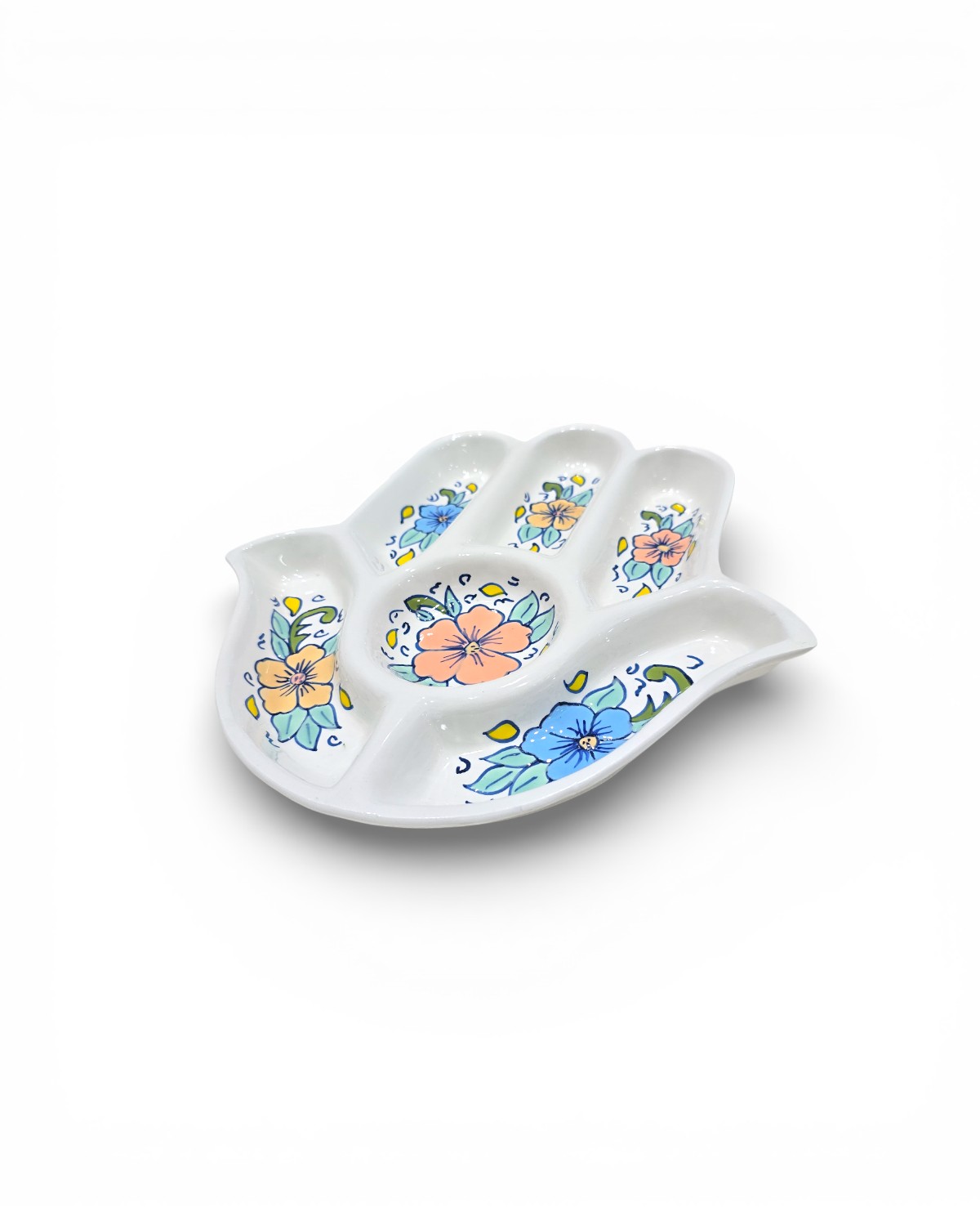 Symbole de protection et de convivialité, le Plateau Apéritif Khomsa Flowers Pastel allie tradition et modernité à travers ses motifs floraux peints à la main aux teintes pastel. Sa forme iconique en khomsa en fait une pièce forte, aussi fonctionnelle que décorative.