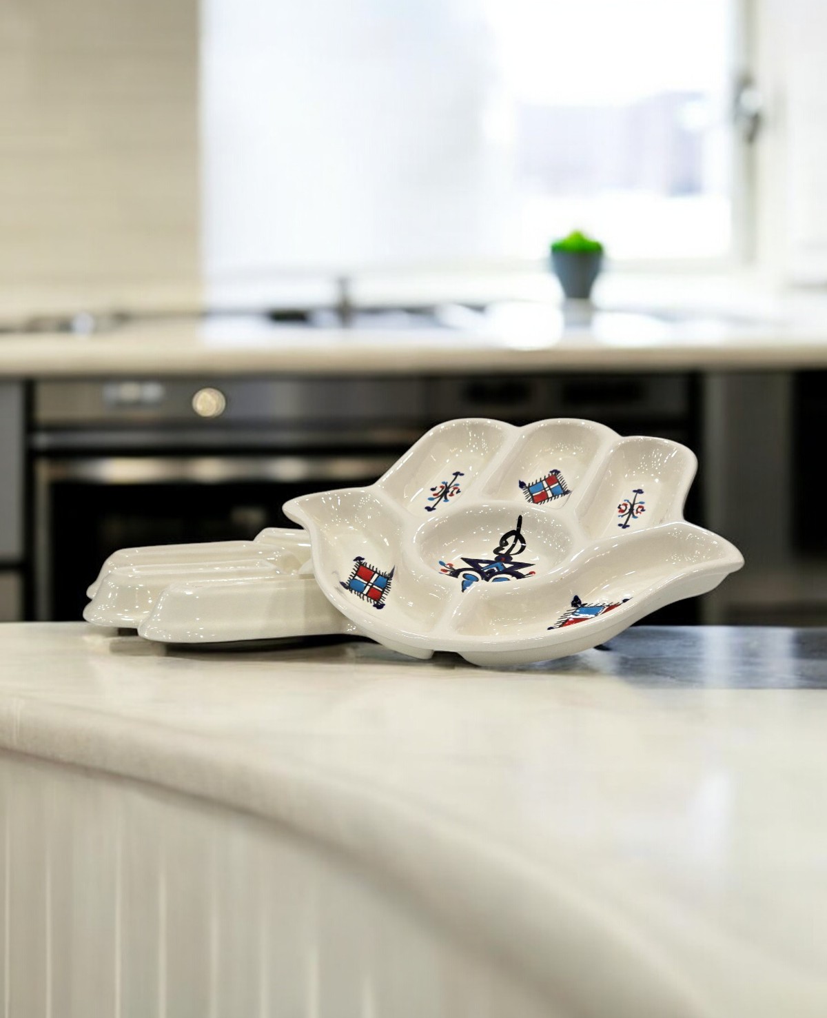 Inspiré de la main de Fatma (Khomsa), ce plat apéritif incarne la protection et l’hospitalité. Chaque détail est peint à la main par nos artisans, révélant un travail méticuleux et une grande richesse culturelle. Sa forme segmentée permet de présenter plusieurs mets dans une même pièce tout en gardant une belle harmonie.