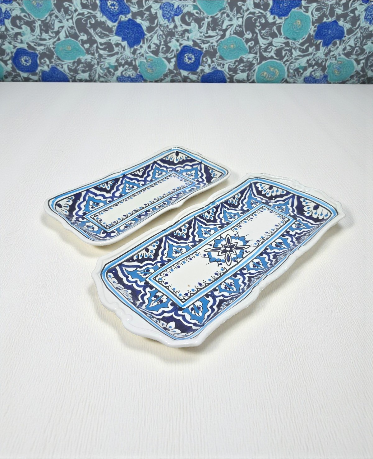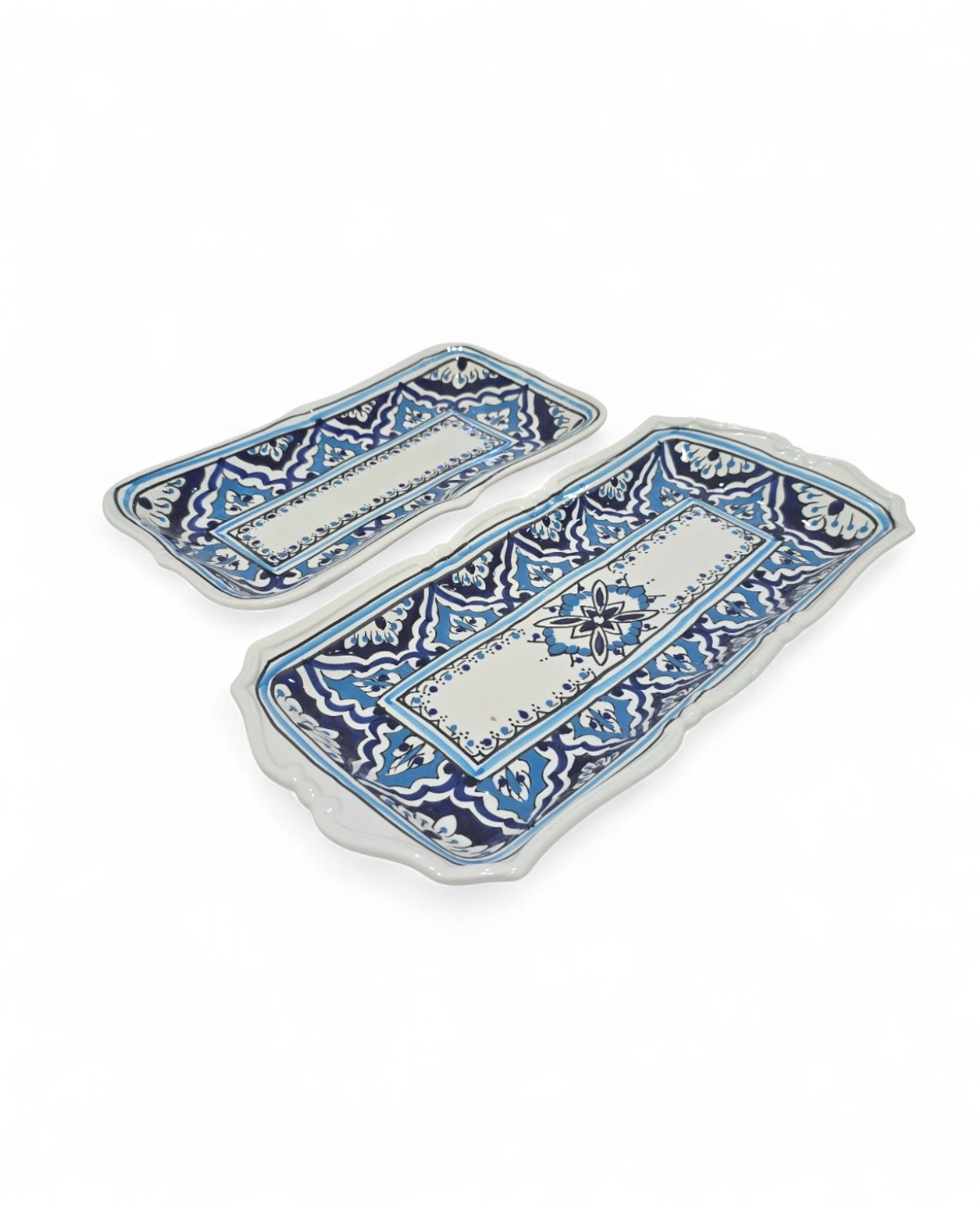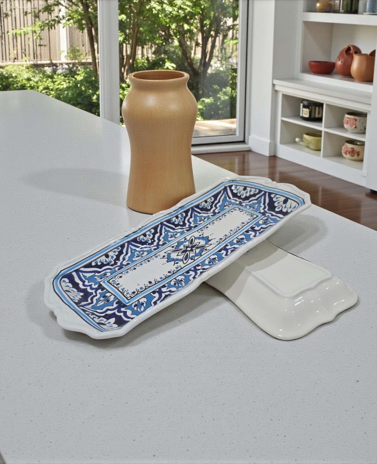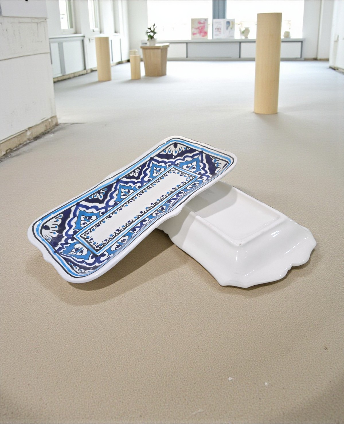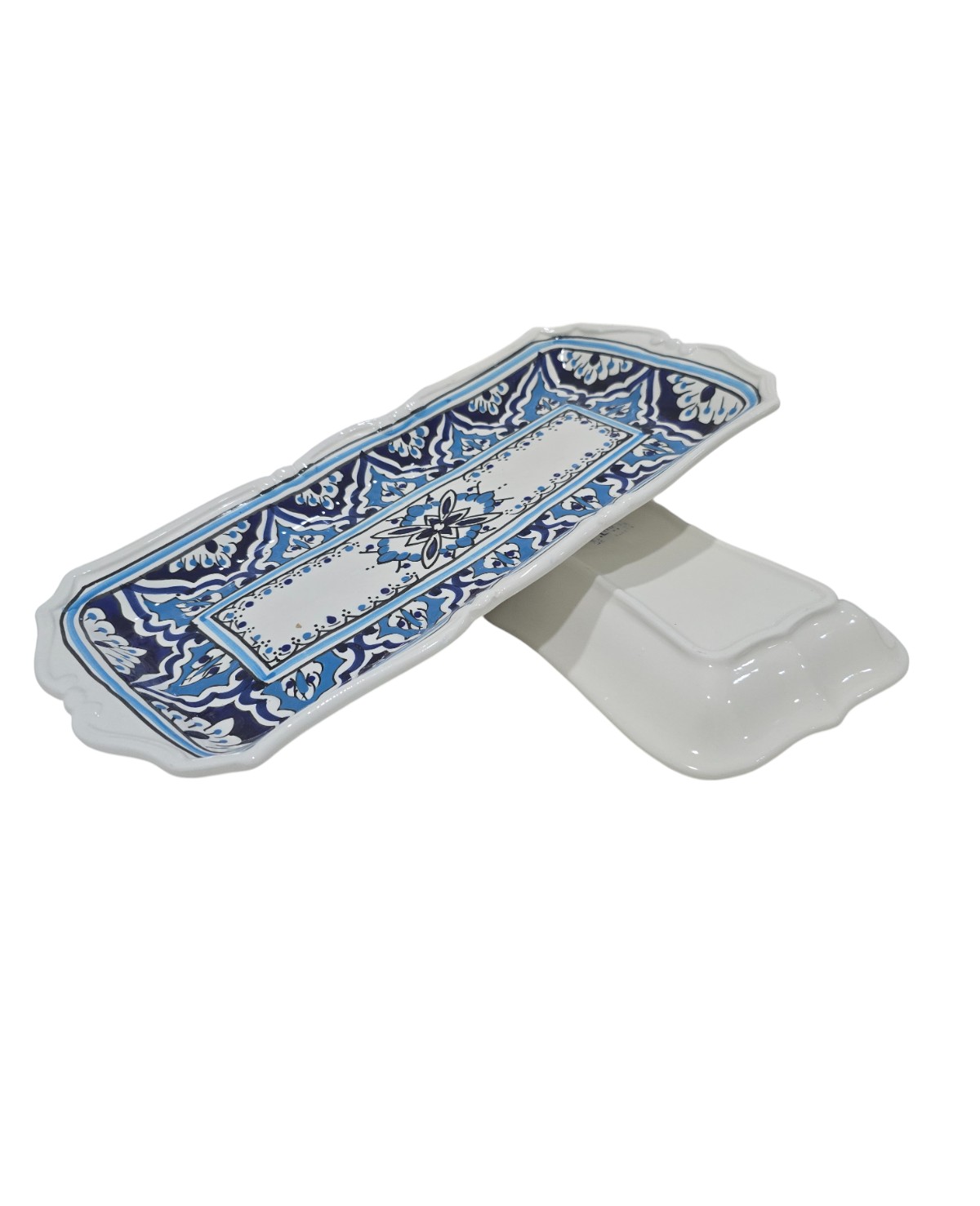 Le Plateau Cake Azur est une pièce artisanale peinte à la main par les maîtres potiers de L’Artisan by Kerkeni. Son design rectangulaire et ses bords élégamment travaillés évoquent les lignes de la céramique traditionnelle tunisienne, réinterprétée dans une version contemporaine.