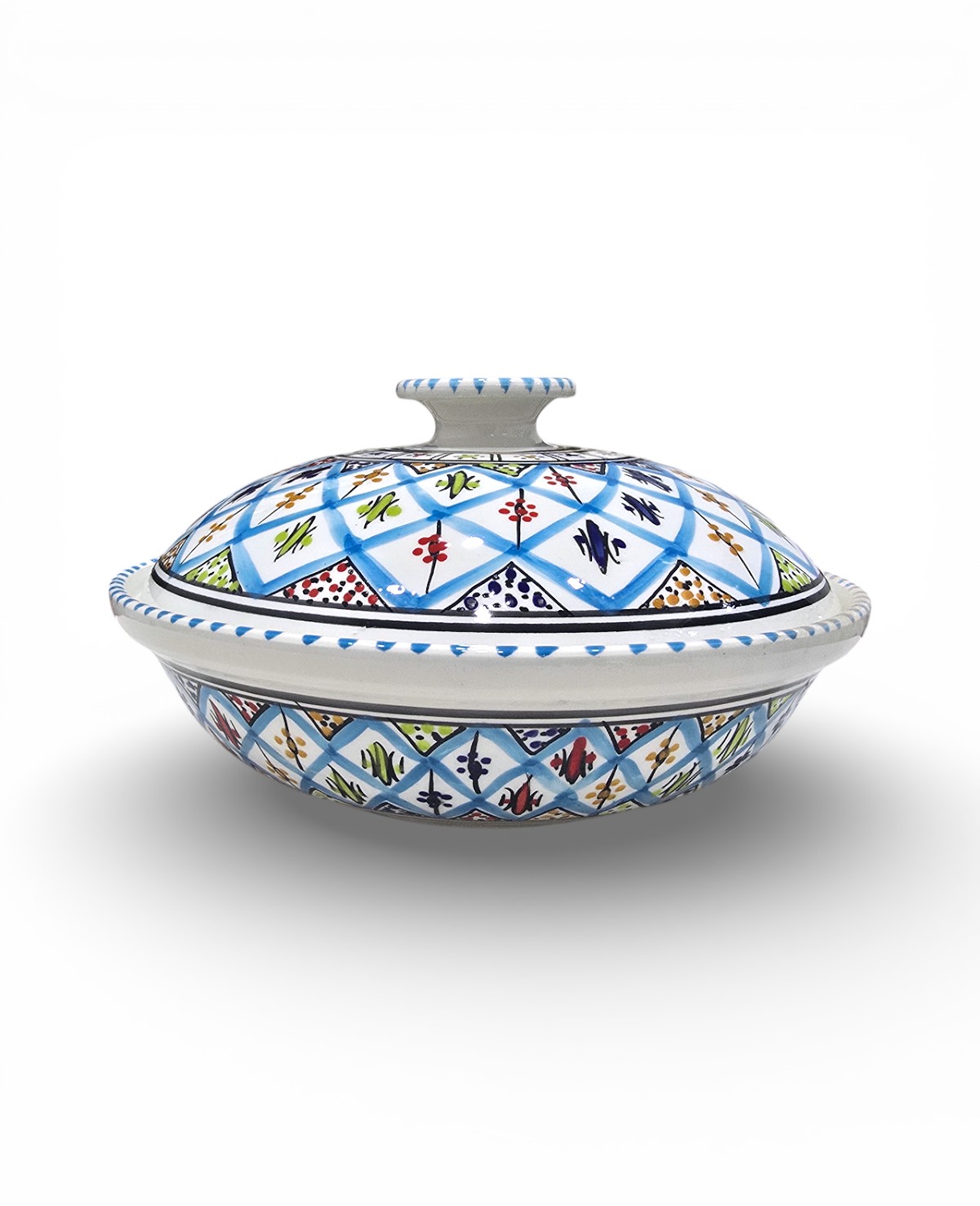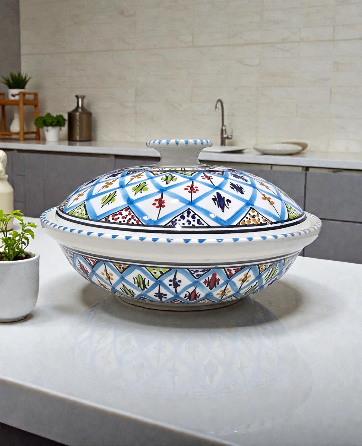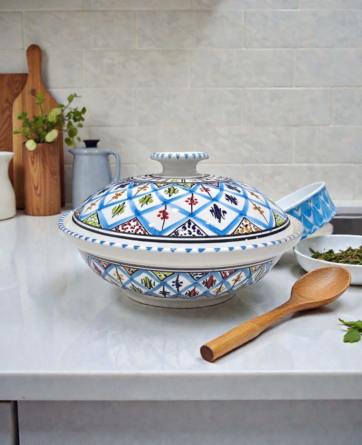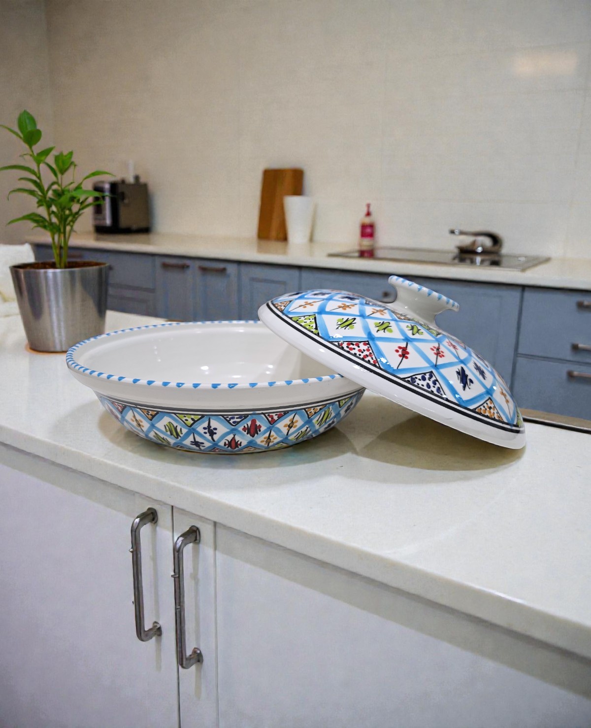 Fabriquée à la main à Nabeul, la soupière Arabesque Turquoise allie tradition et praticité. Son couvercle permet de conserver la chaleur des préparations, tandis que sa forme généreuse la rend idéale pour les repas en famille ou entre invités. Les motifs arabesques peints à la main reflètent le savoir-faire artisanal tunisien, faisant de chaque pièce un objet unique et décoratif.