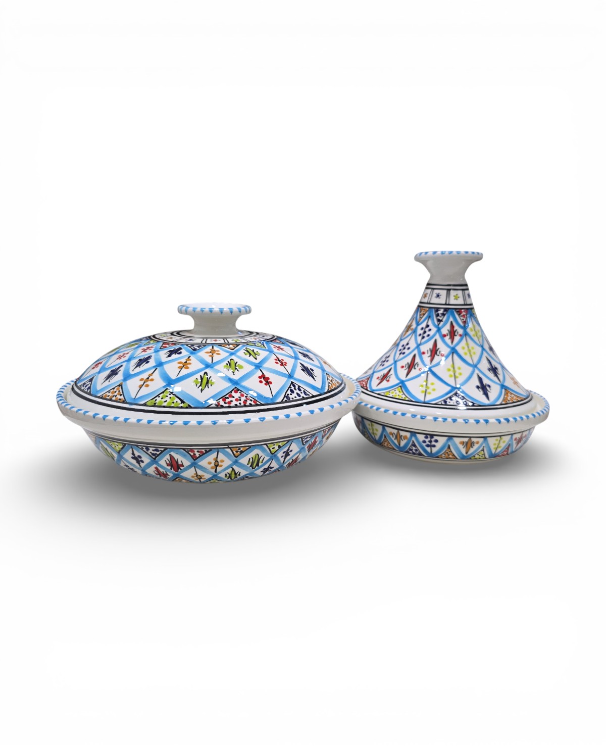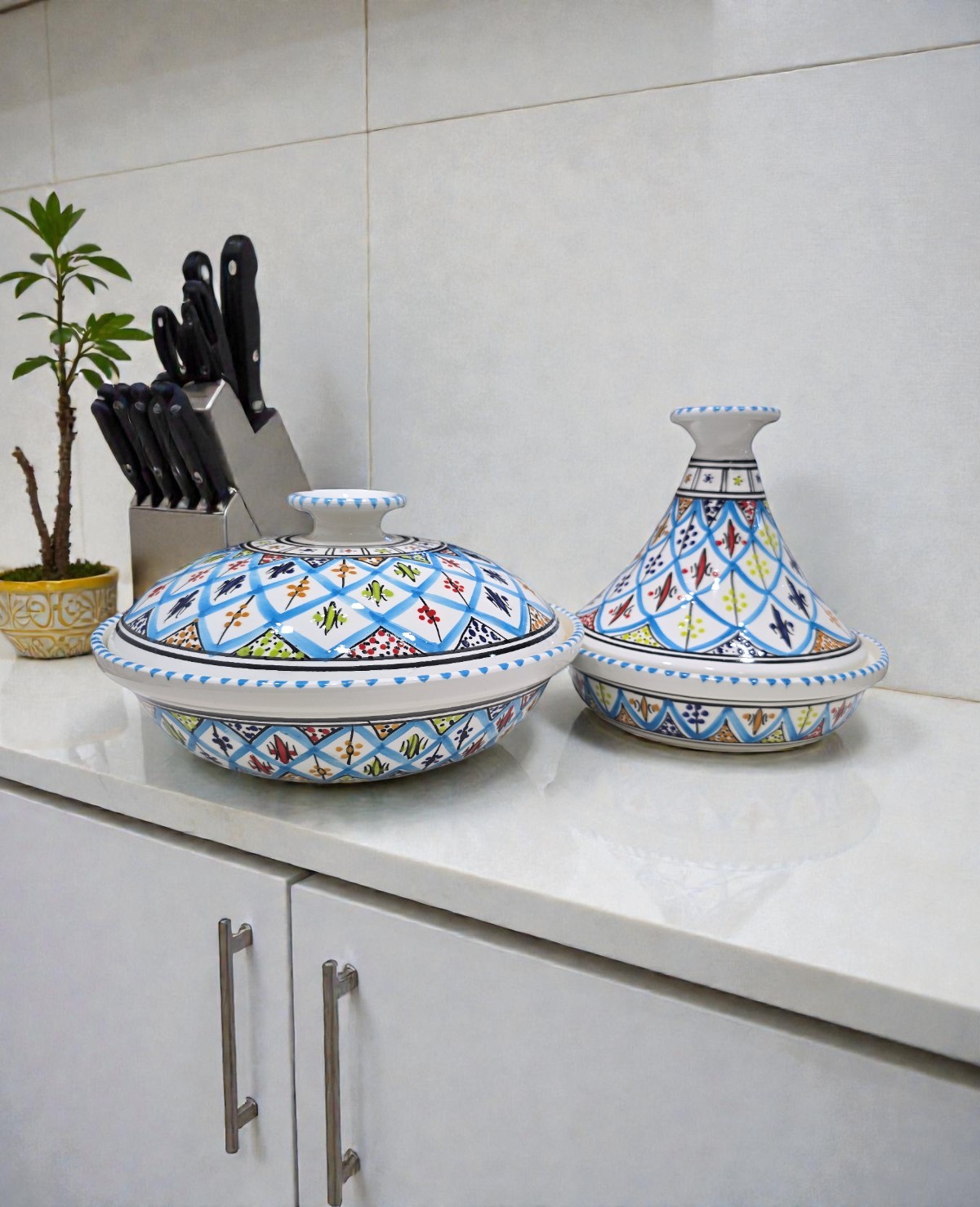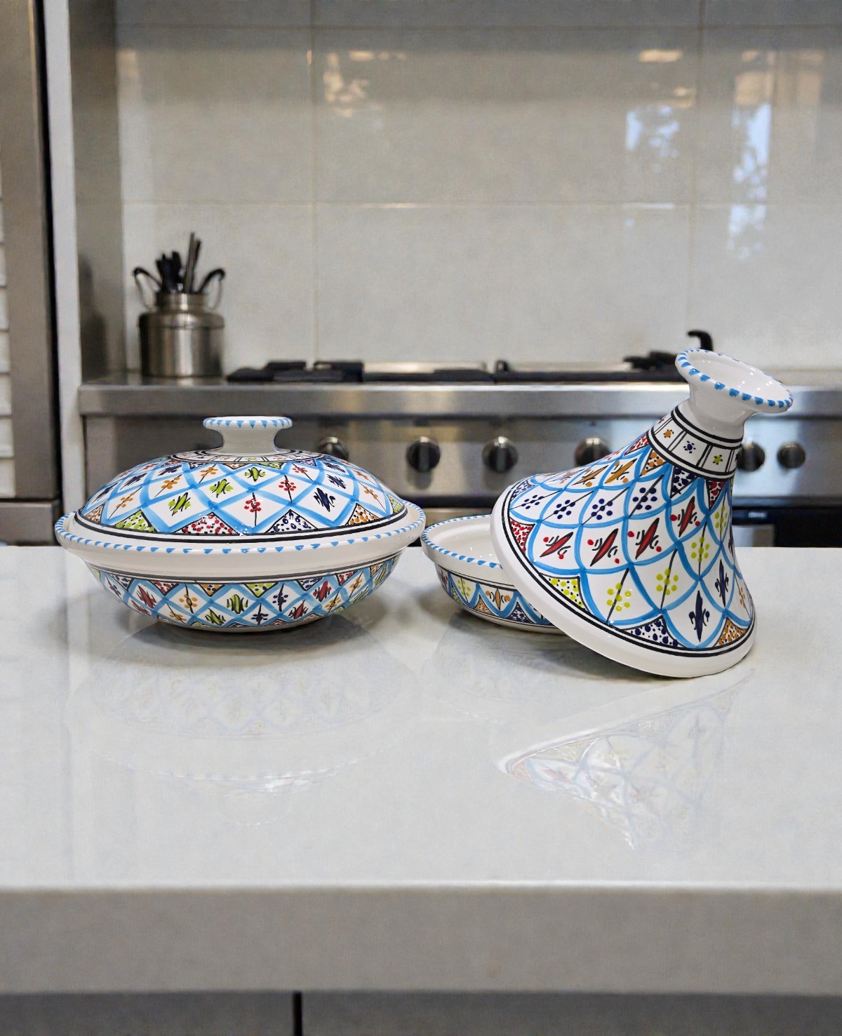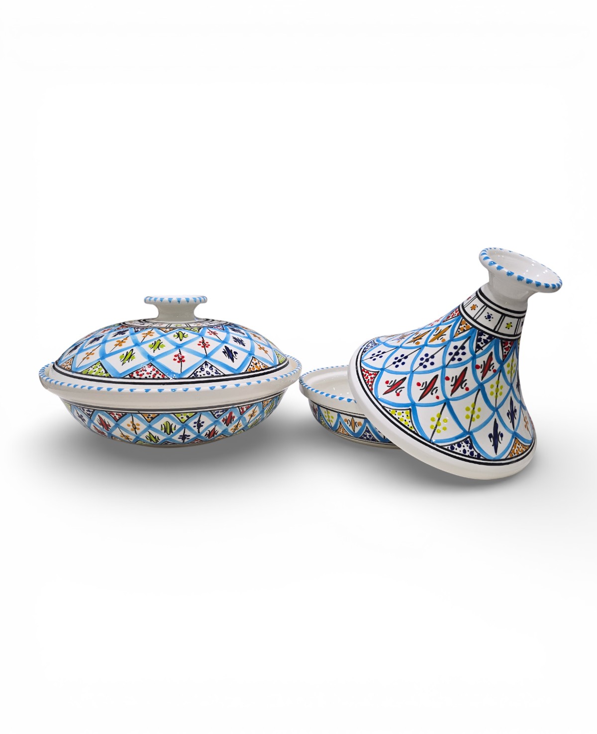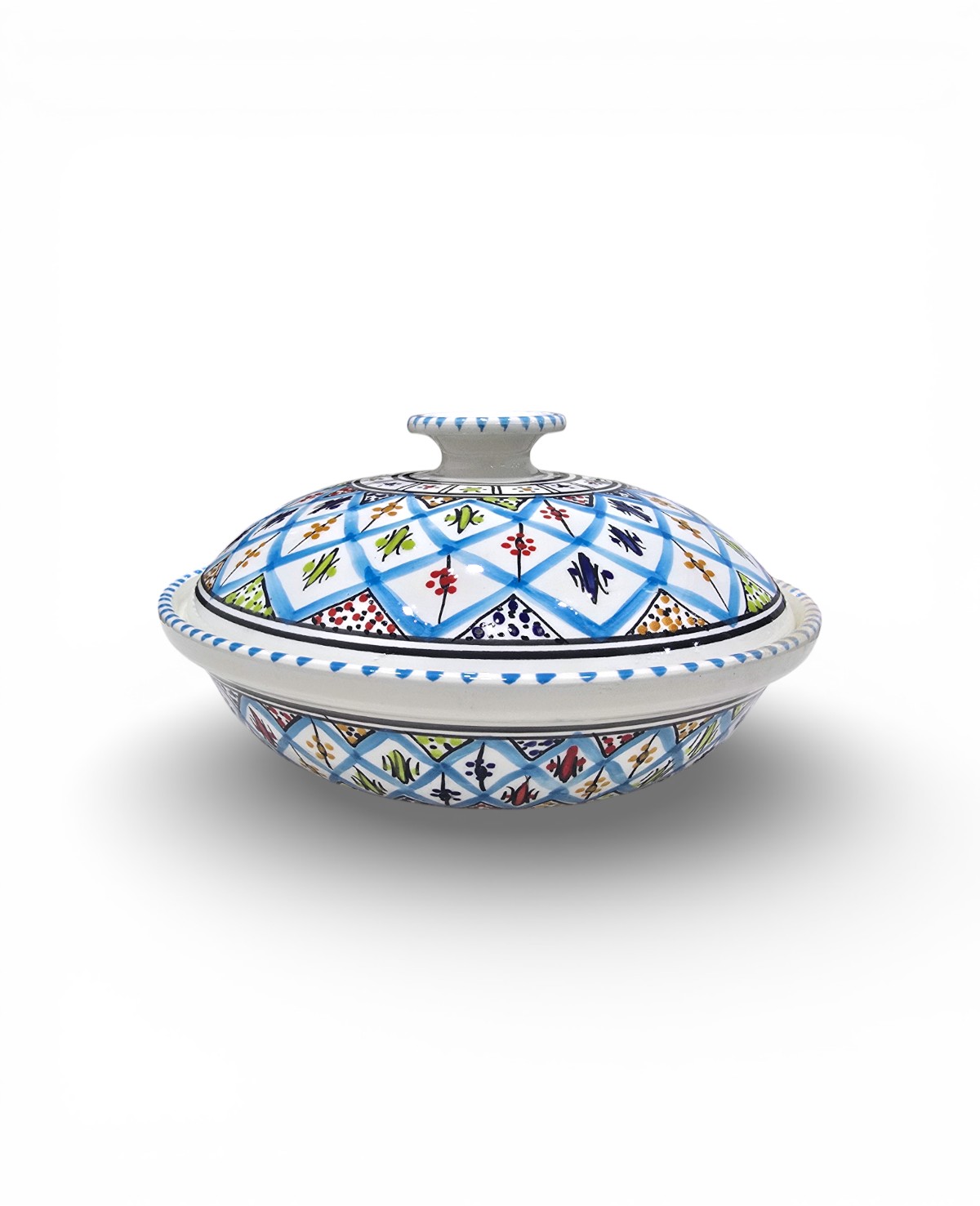 Fabriquée à la main à Nabeul, la soupière Arabesque Turquoise allie tradition et praticité. Son couvercle permet de conserver la chaleur des préparations, tandis que sa forme généreuse la rend idéale pour les repas en famille ou entre invités. Les motifs arabesques peints à la main reflètent le savoir-faire artisanal tunisien, faisant de chaque pièce un objet unique et décoratif.