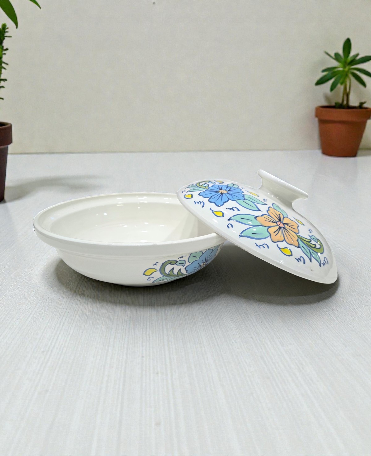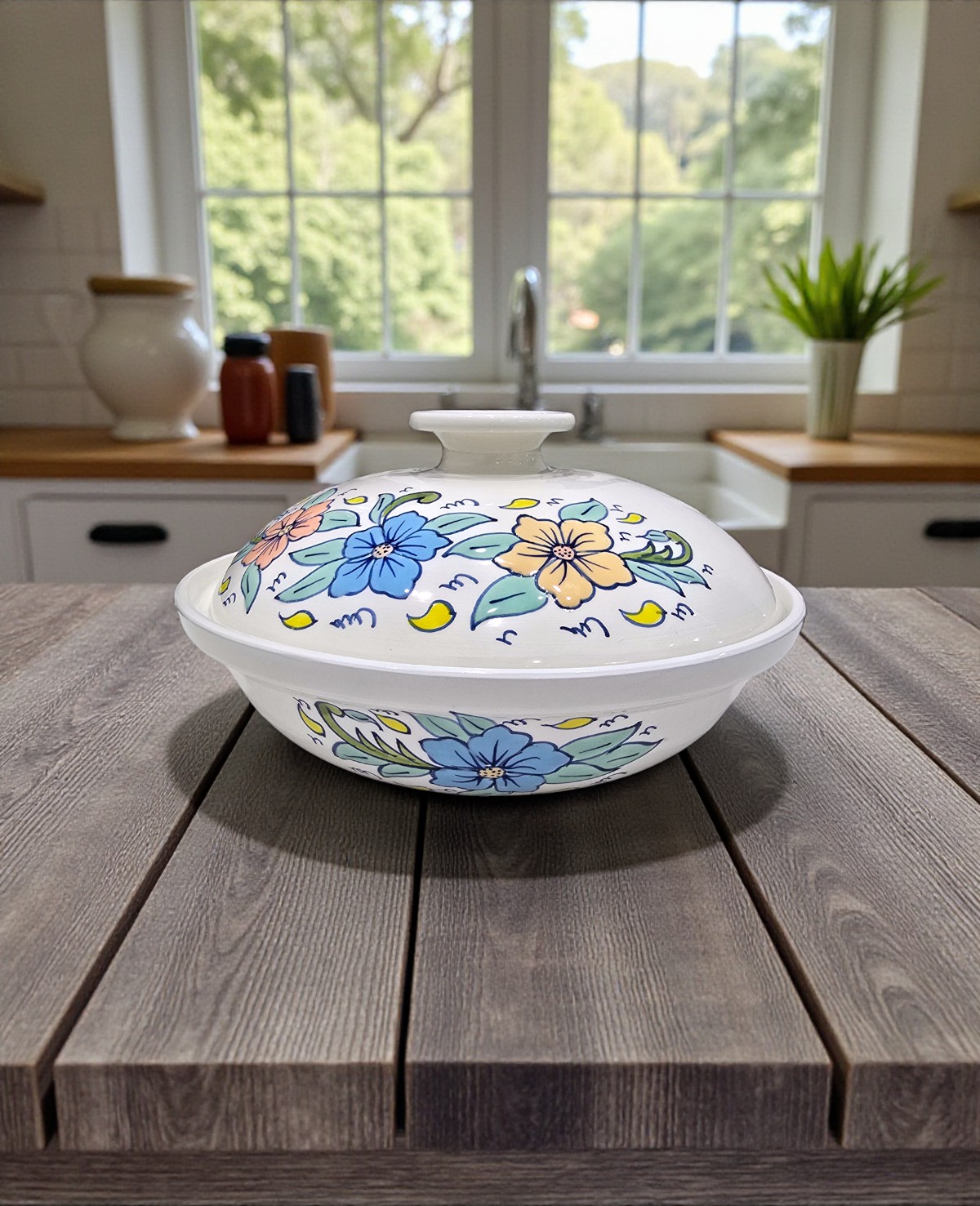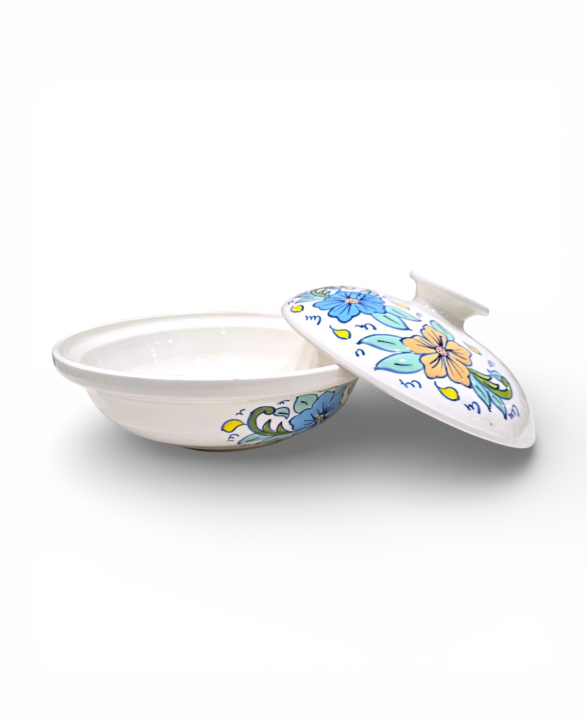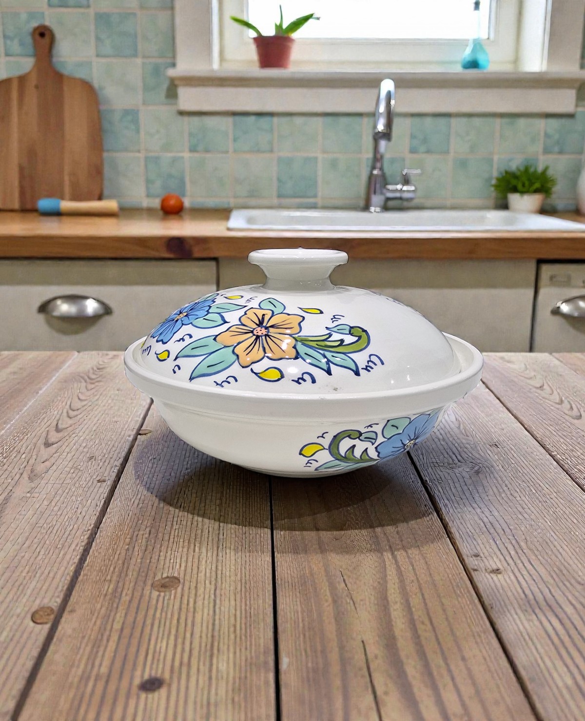 Ses motifs floraux pastel, lumineux et harmonieux, apportent fraîcheur et élégance à la table. Idéale pour servir soupes, ragoûts ou plats familiaux, cette soupière combine fonctionnalité, esthétique et authenticité artisanale.